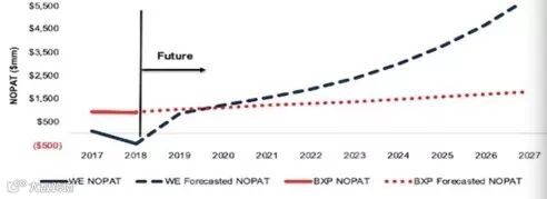 根据美国独立咨询机构NEW CONSTRUCTS, LLC的分析数据,用绝对估值法来计算WeWork和BXP的市值,可以更为明确地看到两者未来的收益比较。