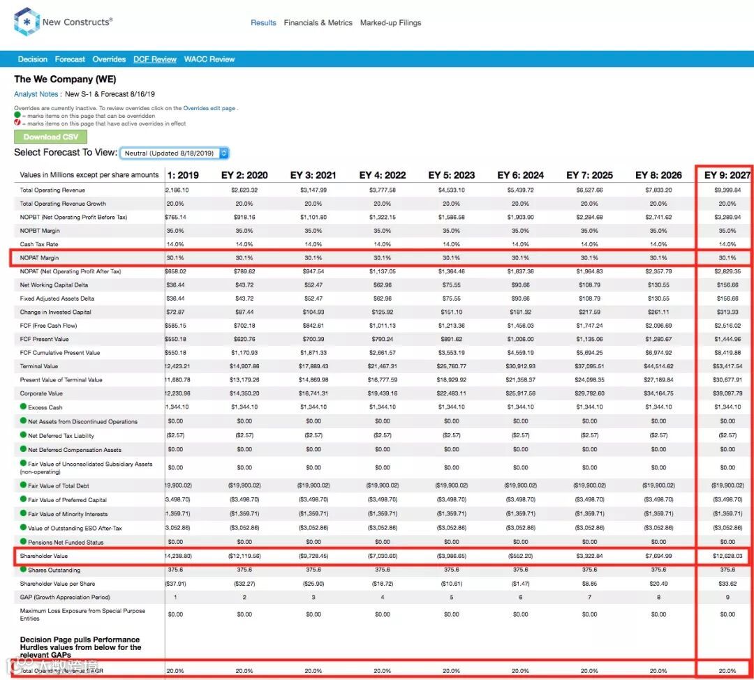 从数据计算来看,即使WeWork目前达到和BXP相同的NOPAT,只要年复合增长率没有超过30%,估值就不可能达到470亿。假设年复合增长率是20%,那么它目前的估值只有126亿美金。