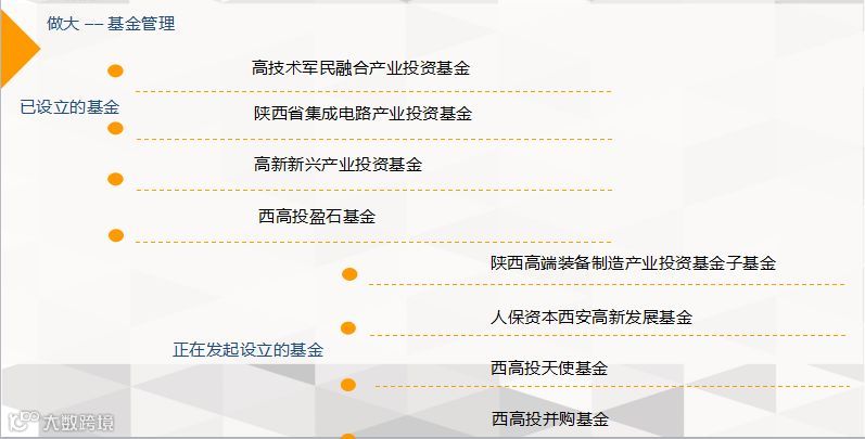 截止目前,西高投管理资产规模超过110亿元,旗下有西安高新新兴产业投资基金、陕西省集成电路产业投资基金、高技术军民融合基金、高端装备制造产业投资基金等多支基金,近期还在筹备并购基金、天使基金等。