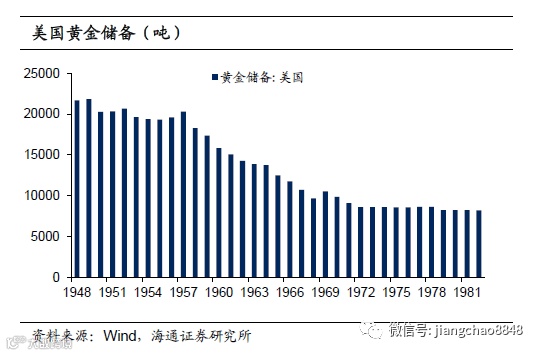 而黄金价格上涨则是因为1971年布雷顿森林体系解体。早在1944年7月,西方主要国家签署了《布雷顿森林》协定,构建了以美元和黄金为基础的布雷顿森林体系,自此黄金兑美元的价格一直维持在35美元/盎司。但是60年代后美国黄金储备因为越战等多重原因快速下降,1971年美国黄金储备已经降至9069吨,仅为1957年的44%。随后美国不得不在1971年8月宣布停止以美元兑换黄金,布雷顿森林体系解体,以美元计价的黄金价格开始飙升,并在1974年达到183美元/盎司的历史新高。