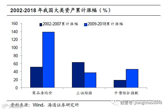 分阶段来看,商品房价格在09年后一路上行,而金融资产止步不前。我国股市在06-07年出现一波大牛市,而08年受金融危机冲击又大幅下跌。如果不考虑07-08年的异动,可以发现我国的资产表现其实可以分为金融危机之前和之后两个阶段。02-07年,股市的表现好于楼市、债市,而09-18年的十年里房价大幅上涨,股市、债市涨幅有限。