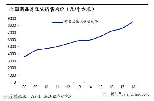 对资产而言,货币超发的环境下,首要的就是防止跟随货币贬值,因而保值属性强的实物类资产房地产也就从中受益最多。07年末,我国的广义货币M2规模40万亿元,到18年超过了180万亿元,增加了3倍多,而同期我国一线城市房价涨幅接近3倍,全国商品房住宅销售均价也增长了近1.5倍。