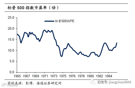 而在滞胀环境下,股市也难有较强表现。物价和利率的上行也抑制了消费和投资,需求疲软拖累经济,美国GDP在1974年和1980年均出现过负增。在滞胀的环境下,美国股指长期不增长的局面也就不难理解。一方面,通胀带动利率上行,股市估值被不断压缩,美股市盈率从1972年12月的19.1倍下降至1979年12月的7.4倍。另一方面,经济表现较差也导致企业经营出现恶化,带动盈利下滑。