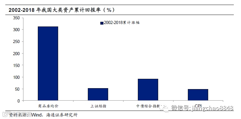 2002-2018年,我国房价、债券、股票的累计涨幅为313%、92%和52%,房地产的回报远远超过同期的金融资产,而上证综指的收益率仅勉强跑赢CPI的涨幅49%。