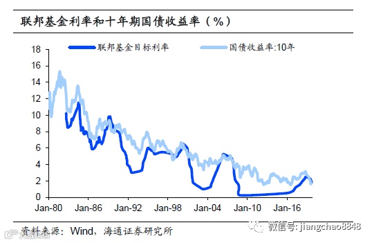 长期的低通胀环境使得美国利率中枢不断下移,债券走出长牛行情。由于美联储的货币政策目标在于通胀和就业,一直处于2%左右的温和通胀环境有利于美联储在经济出现低迷时能够放开手脚实施宽松的货币政策,这导致联邦基金利率在多次降息周期后不断下移,带动美国债券市场利率中枢也出现明显下降。在利率不断走低的过程中,投资债券不光能够获得票面利息还可以获得价格变动带来的资本利得。