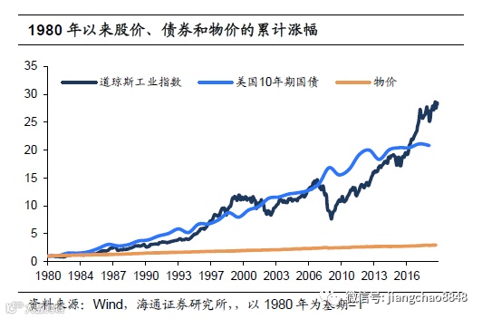 80年代以后才是真正属于金融资产的辉煌时代。1980年以后美国的股市和债市开始大幅跑赢其他资产。道琼斯工业指数从1980年12月的945点上升至2019年9月的26900点,累计增长了27倍多,而1980-2018年间持续进行债券投资也能够获取近20倍的投资回报,相比之下物价仅上涨了2倍。尽管2001年和2008年因为互联网泡沫和次贷危机导致股市出现过阶段性回落,但是随后美国股市都能短期调整后继续上涨并再创新高。