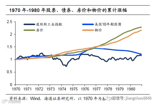 金融资产的垃圾十年。10年间美国股市基本没有出现上涨,1970年12月道琼斯工业指数为821.5点,到了1979年12月道琼斯工业指数仍然只有836.1点。而如果投资债券,在1976-1980年间债券资产将因为收益率的上行而出现亏损。与物价的涨幅相比,无论是股票还是债券都没有起到保值作用。