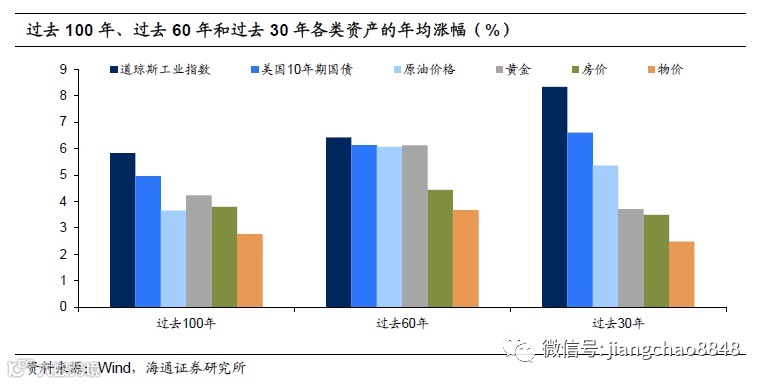 其实不光是从100年的维度来衡量,从60年和30年的维度来看,金融资产的投资收益也都好于实物类资产。尽管以过去60年的维度来看,原油和黄金的投资收益大幅上升,但股票和债券的收益仍能维持在较高水平,年化回报率相比于过去100年的5.8%和4.9%小幅上升至6.4%和6.1%。