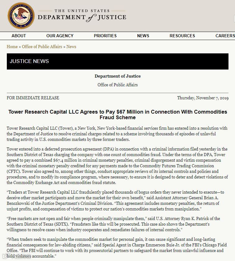 2019年11月7日,美国司法部和商品期货交易委员会(CFTC)发布通告称,高频交易公司Tower Research Capital同意签署了一项延期起诉协议(DPA),支付6749万美元,以了结关于其三名前交易员从事“挂单欺诈”的指控,仅限于公司层面。
