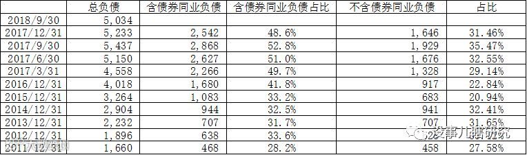 那么之前这么快的增长速度,是靠什么来支持的呢?答案就是靠同业负债。我们可以看到,在16年的时候,包含债券在内的同业负债占比已经超过了40%并很快上升到了53%,比例惊人。