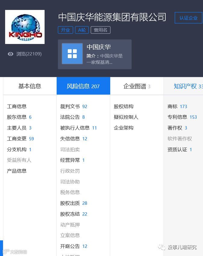 再看第六和第七的宁夏银行和北大方正,虽然这里资质都一般,但是还是国字姓比较稳一点。接下来就是第八的庆华能源了,棒棒哒,比前面的都棒,不论是涉案数量还是失信人信息还是股权冻结都创了新高。15年年报里还有一个庆华系的内蒙古庆华集团,这里不再赘述。