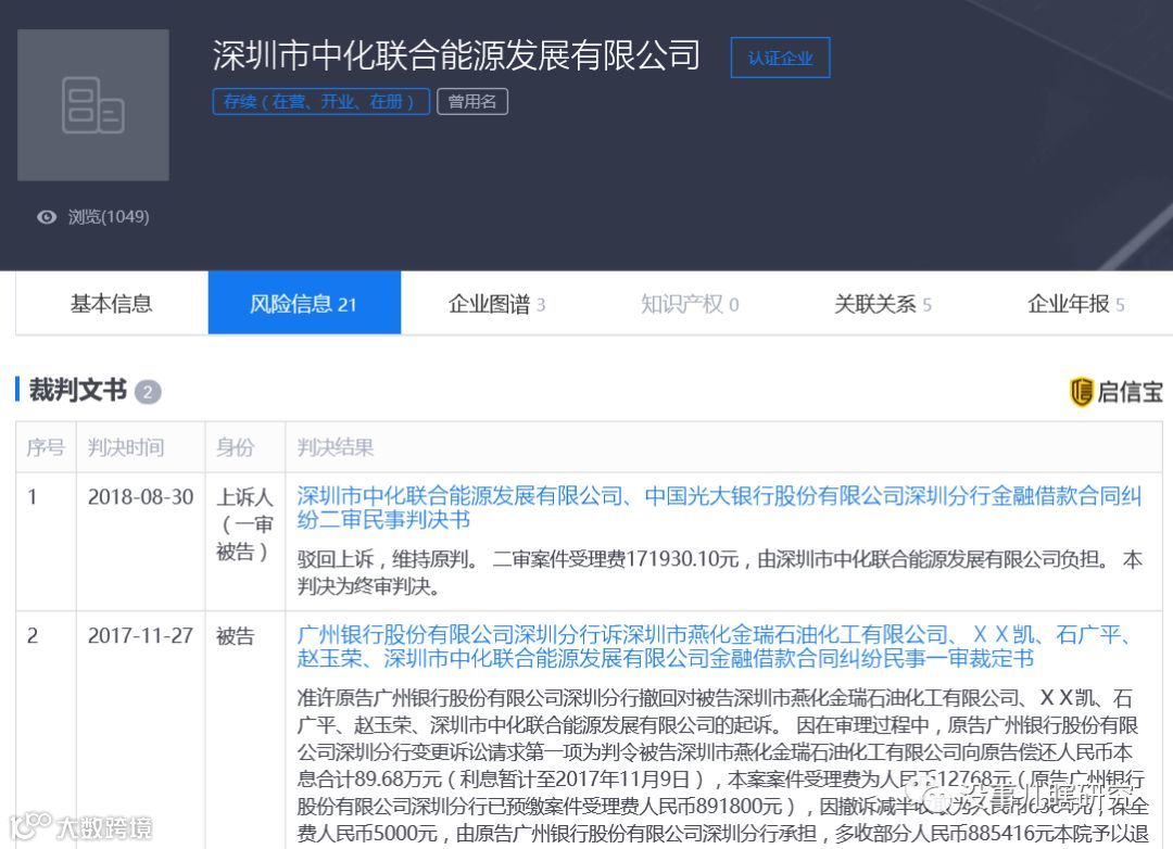 再来看第三的深圳市中化联合能源发展有限公司,也已经被银行告上了法庭了。