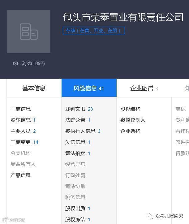 先来看荣泰置业,2016年的时候已经被列为失信人了,被执行人信息有3条,股权还被冻结。