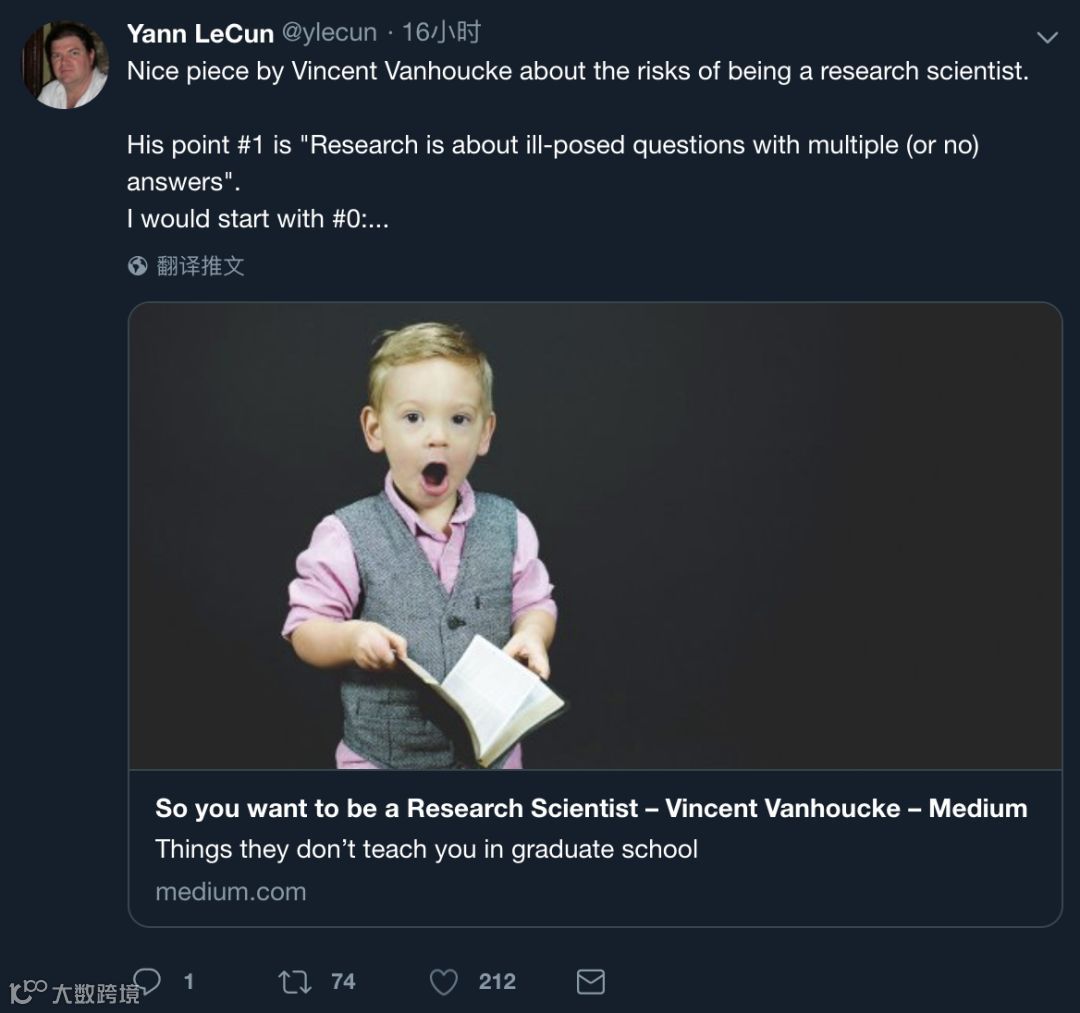 作为 Vincent 的同行,人工智能先驱, FAIR 负责人 Yann LeCun 看到这篇文章之后表示非常赞同:成为研究科学家有风险。同时他也在九条之前加上了一条第零规则:研究是为了制定更好的问题。
