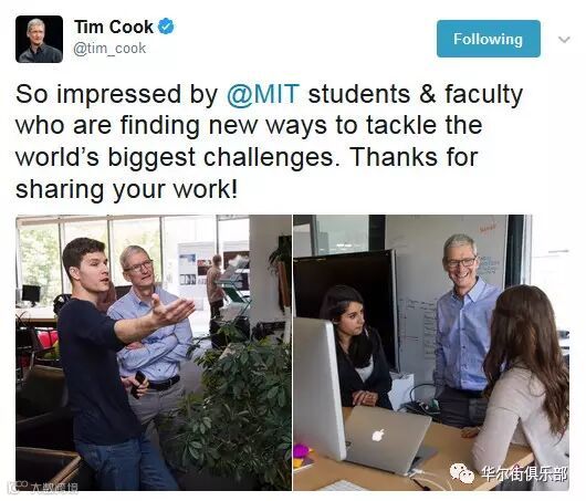 这次演讲前,库克就在Twitter上晒出了自己在麻省理工的照片,说:MIT的师生们太令我震撼了,他们正在想方设法应对世界上最重大的挑战。谢谢你们分享你们的成果!
