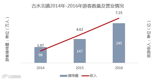 从2014年开业至今,古水北镇的经营业绩“一路狂飙”,令人咋舌。2014年,古水北镇的游客接待量为98万,实现旅游收入1.97亿,2016年,游客接待量达到245万,实现旅游收入7.35亿。 而其师出同门的乌镇景区,从2007年营业开始,直到2013年,其营业收入才突破7个亿。