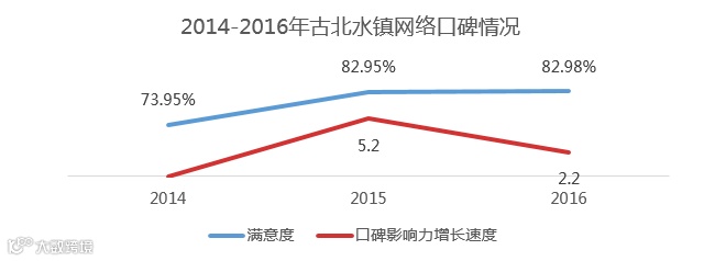 根据Tripadvisor统计数据显示,OTA上游客点评的差评率每降低0.1分,酒店预定订单会提高3%。古北水镇通过不断提高网络游客满意度和口碑影响力来提高整个品牌的知名度。通过对携程、途牛、驴妈妈、美团等10多个渠道的游客点评分析数据可知,古北水镇开业第一年,网络口碑影响力很弱,在各大渠道上的口碑总量只有403条,游客满意度也不理想;而到了第二年,网络口碑影响力迅速扩大,口碑影响力提高了6.2倍,游客满意度也提高了近百分之十个点,第三年,在保持游客满意度稳定提高的同时,快速扩大口碑的影响力,2016年网络口碑影响力是2015年的3.1倍。此外,古水北镇的微信公众号阅读量也从2014年的平均每篇200左右的点击量上升到2016年平均3000的点击量,点击率上升了15倍。可见,古北水镇通过网络传播的方式形成了较好的游客口碑传播,对于营收增长起到了较强的正面促进作用。