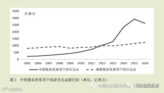 其一,服务贸易旅游支出金额高速增长,达到同期美国出境旅游支出金额两倍。随着中国居民收入水平日益提高,中国家庭出境旅游的机会越来越多,对外汇的需求也随之增加。2014年之前,中国的海外旅游支出大致是以年均20%速度增长。然而,2014年增速突然飙升到80%,此后总体规模一直保持在高位。2015-2016年,中国大陆海外旅游支出总额达到5500亿美元,是同期世界第二大旅游支出国——美国海外旅游支出的两倍(下页图1)。有研究表明:2014-2016年期间中国的旅游支出中很大一部分不能用会计因素或经济基本面因素解释,而且,旅游支出与国内增长成反比,与人民币兑美元贬值预期成正比[5]。