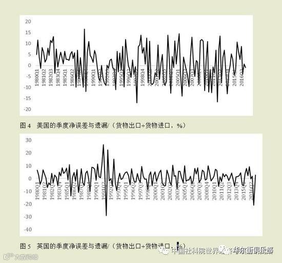 图4和图5是美国、英国误差与遗漏的时间序列,其路径充分反映了白噪音的特征。中国的误差与遗漏时间序列则显示了系统性趋势,这种趋势同汇率变动存在明显相关关系。