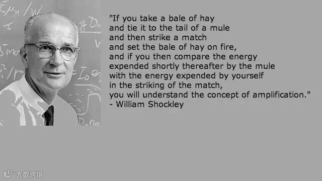 后来,贝尔实验室在回顾它在二十世纪的发明时,把晶体三极管和计算机操作系统UNIX列为两项最伟大的发明。肖克利不满足于这些,他要进入工业界,用他的晶体管创造一个新工业,并以此致富。肖克利想到了加州老家,和那里在特曼的影响下正发生的令人惊喜的变化。肖克利给特曼打了个电话,特曼说,来北加州吧。