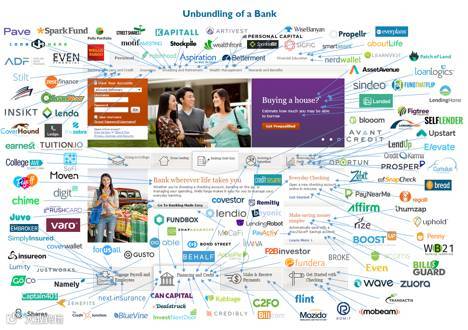 CB Insights汇总了同银行存在直接竞争关系的金融科技初创公司。但在特定垂直行业存在竞争的同时,也表明存在相互合作的良机。下图内含私营网贷平台,以及提供各类金融服务的创业平台。