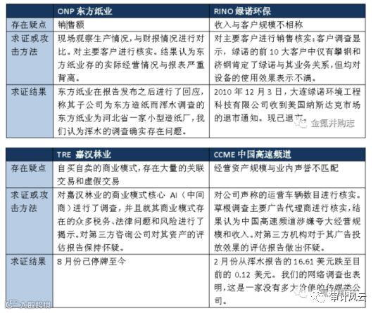 比如浑水对东方纸业的现场调查特别关注了厂区的生产经营活动,从物流的情况来看90分钟内仅1、2量车出入,与其财报所示的销售规模不成比例。浑水对中国高速频道宣称的广告投放网点进行了勘察,结果认为其广告投放效果很差且无特别的技术壁垒。