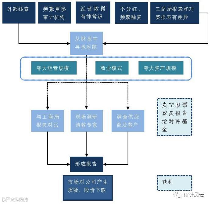 在确定可疑标的后,便从商业模式、经营情况、资产规模等方面寻找公司的问题,然后对各个问题进行取证,手段有查账(多数以公司提供给美国证监局的报表与工商局报表对比)、现场调研以及调查产业上下游情况。
