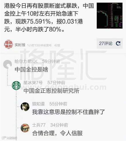 正巧昨天市场碰到了朝韩半岛局势紧张,不明真相的吃瓜群众就把中国金控说成了“中国金正恩控制研究所”,结果控制不住,股票就暴跌了。中国人民的脑洞不是一般的大。