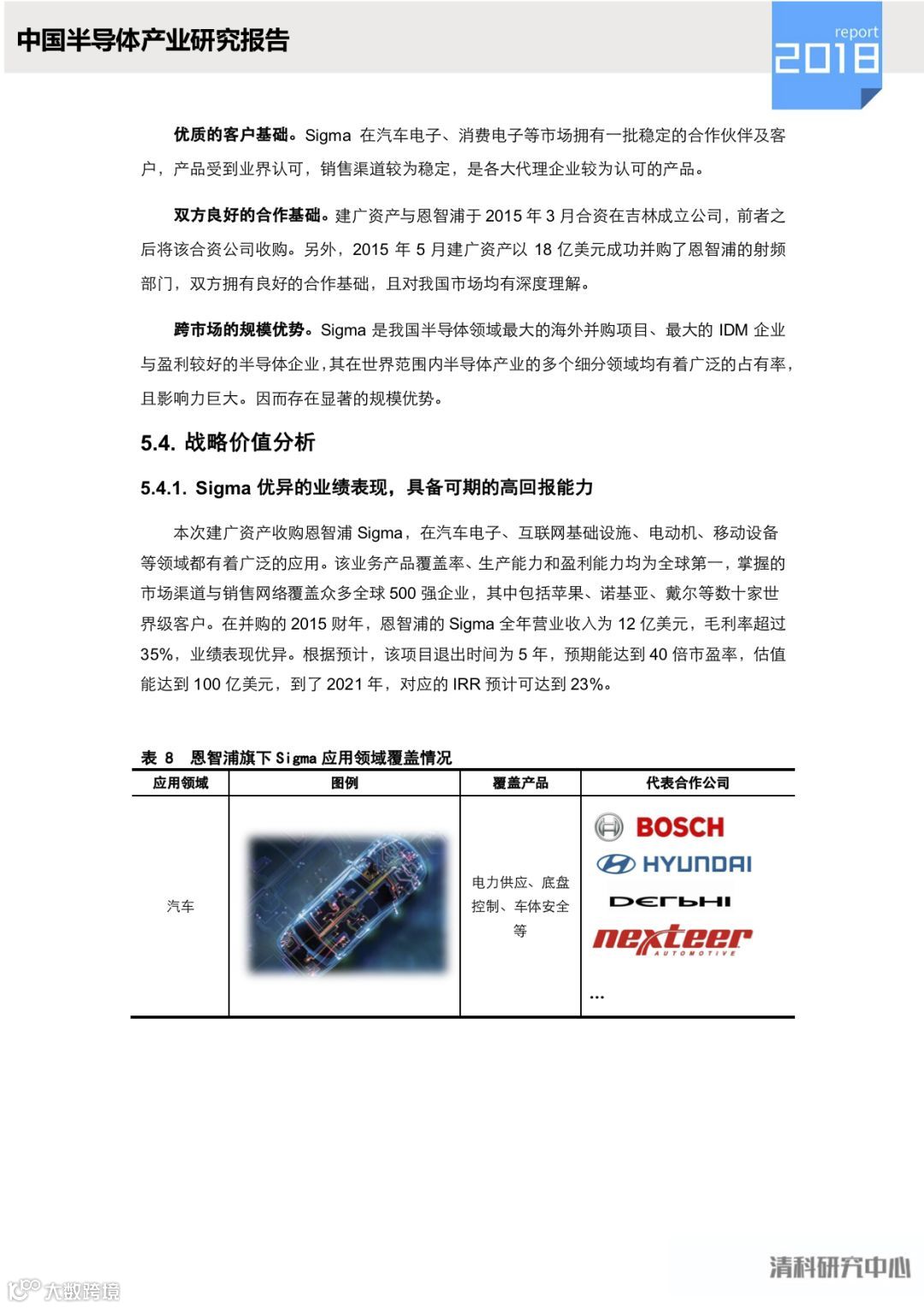 本次并购交易包括恩智浦的设计部门以及位于英国和德国的两座晶圆制造工厂和位于中国、马来西亚、菲律宾的三座封测厂和位于荷兰的恩智浦工业技术设备中心,及标准产品业务的全部相关专利和技术储备,涉及约1.1万名员工。另外,Sigma还是全球屈指可数的得到汽车电子零件供应商认证的企业之一,而我国目前尚无企业通过该认证,因此收购Sigma对于我国半导体产业意义深远。