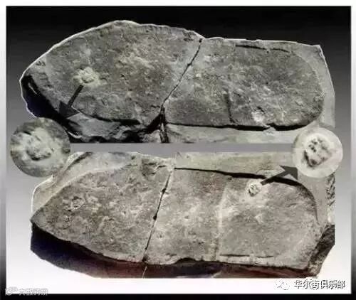 图中左右圆圈中是放大后的三叶虫。名叫威廉•J•米斯特的美国人在敲开这片化石之后,赫然发现一个完整的鞋印就踩在一只三叶虫上,这个鞋印长约26公分,宽8.9公分。