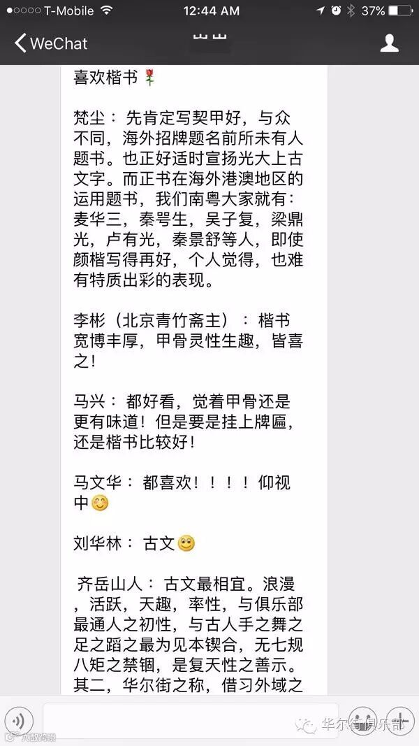 随后经崔女士沟通,崔学路老先生欣然接受我的请求,很快挥毫泼墨书写出了“华尔街俱乐部”的甲骨文。同时也为公众号留下了墨宝。期间还邀请了国内外的书法大师们进行了点评。现一并向大家展示和分享。一来向崔老先生的慷慨热情表示敬意,同时也向长期关注华尔街俱乐部的国内外广大用户表示衷心的感谢!也希望大家为把公众号华尔街俱乐部、华尔街漫画和华尔街收藏办好多提宝贵意见和建议!
