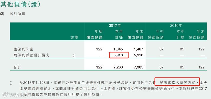 除了创收压力,邮储银行近年来还面临一个更严重的问题——风控。先看邮储银行在2017年年报中披露的一项预计负债: