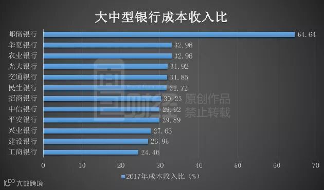 2017年,邮储银行以64.64%的成本收入比在上述12家商业银行中排名第一,高出位列第二名的农业银行近32个百分点。其实,邮储银行的成本收入比也位列41家A股和港股上市银行榜首。