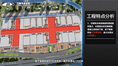 深圳国际会展中心项目拥有全球房屋建筑领域面积最大、长度最长的无缝钢筋混凝土结构地下室,地下室面积达57万平方米,最大长度达1700米,步行须约20分钟。