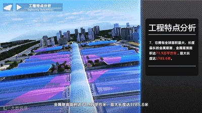 深圳国际会展中心项目拥有全球面积最大、长度最长的金属屋面,金属屋面面积达73.9万平方米,最大长度达1785.6米。