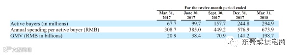 首先来看一下他们的各项业务指标。截止到2018年3月底,拼多多在过去12个月创造了1987亿元的交易额,同比增长851%。活跃用户2.95亿,去年同期为6770万,上涨336%。单客交易金额从2017年3月底的308.7元/年上升到现在的673.8元/年,增加了118%。2017年和2018年1季度,来自移动端的订单数量分别为43亿和17亿。截止到3月底,拼多多平台上活跃卖家超过100万。这印证了一直以来的外界猜测,即拼多多已经成为继淘宝、京东后的中国第三大电商平台。