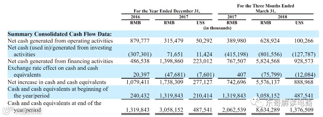 此外,值得一提的是拼多多的现金流。其经营现金流净值为正数,2018Q1为6.3亿元。所以,虽然业绩成长迅猛,但拼多多其实并不是一家烧钱的公司,其账面现金从2016年的13.2亿上涨到今年1季度的86.3亿。这次募集资金后,他们或许会在并购、研发等方面有更大的投入。