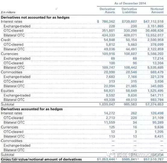 下表是高盛2014年在各类衍生品市场进行对冲和非对冲交易的衍生品分类统计。