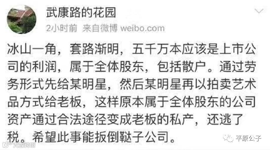 还有一种骚操作,你知道的,拍电影电视剧的时候,有时候钱给大发了,数额有点吓人,而且来历不明,阴阳合同也不好使,那么就可以拉上艺术品市场一起玩了。比方说,上市公司开出一份五千万的劳务报酬,给某个明星,这位明星就拿这钱去拍卖会买个艺术品,这个破逼艺术品,其实就是老板的私产。