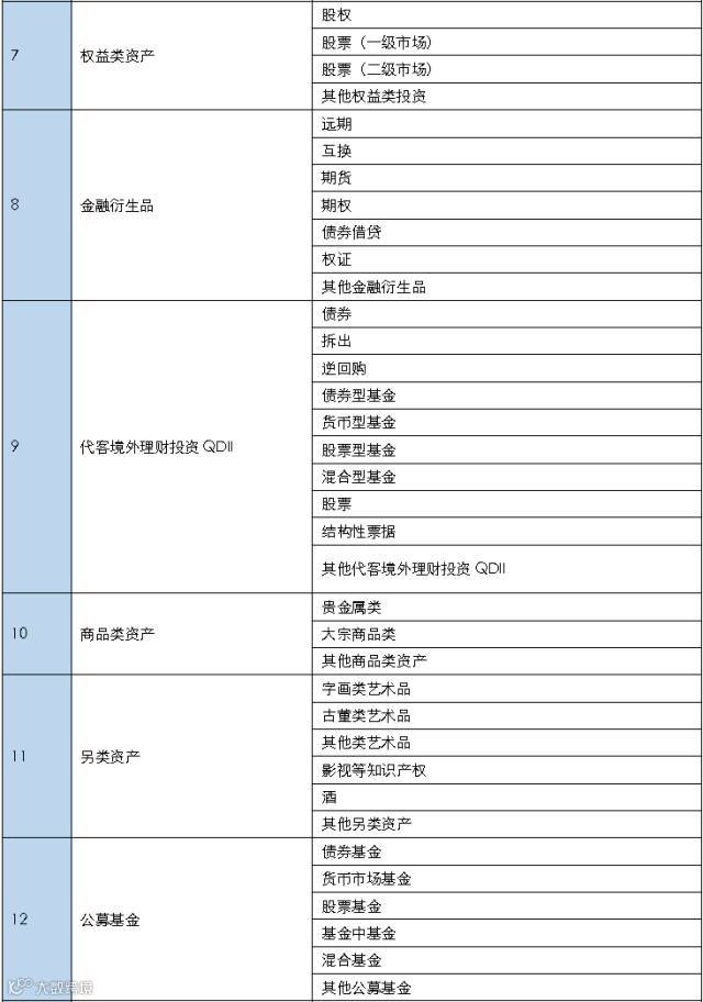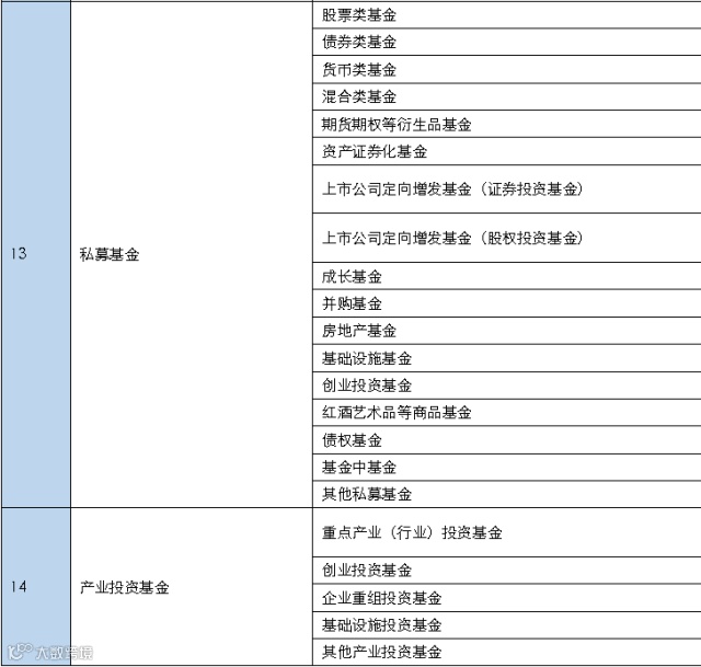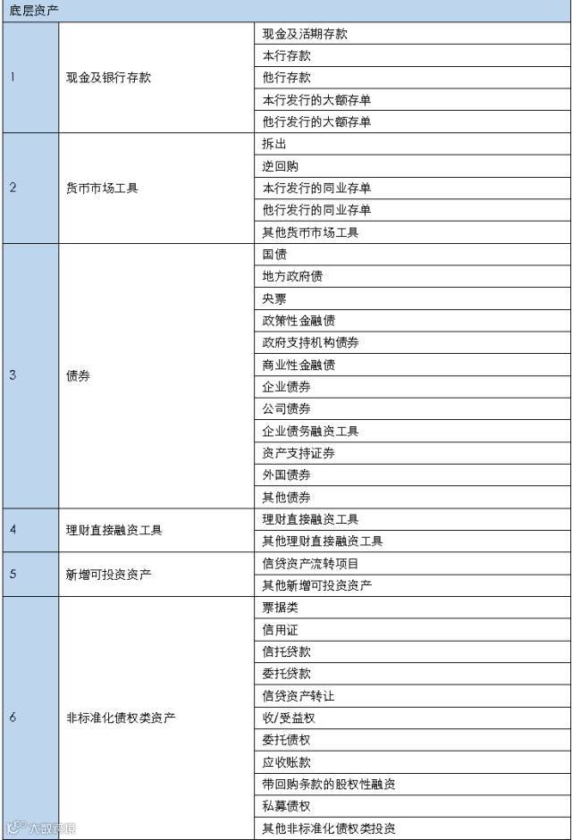 2015年11月30日中央结算公司发布的《关于增强全国银行业理财信息登记要素等事项的通知》(中债字[2015]108号,下称《通知》),底层资产划分为15类,除去第15类历史遗留数据无法归入前14类的之外,目前仍在用的其实就是前14类: