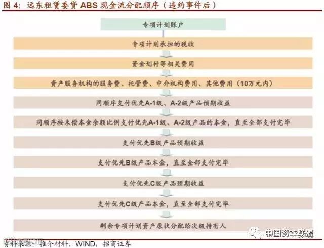 信用触发机制是指在资产证券化产品中设计相应条款,当某些事件触发相应条款,则会导致加速清偿或现金流重新安排。以远东租赁委贷ABS为例,该期专项计划主要设计三项触发机制,包括:权利完善事件、加速清偿事件和违约事件。当原始权益人(远东租赁)或者相关参与机构触及权利完善事件、加速清偿事件和违约事件,基础资产的现金流支付机制将重新安排,从而为优先级证券提供信用支持。