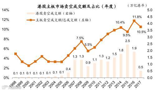 卖空,又称做空、沽空,是通过股价下跌获利的交易手段 。目前香港资本市场可以做空的方式包括卖空证券、交易股指期货、期权、权证、牛熊证等,本报告主要讨论的是对一般证券的合法做空,即当看跌某一指定可做空的证券时,先向他人(如经纪商)借入该证券出售,当股价下跌后再从市场低价购买证券归还出借人,赚取股价下跌的差价。做空是成熟资本市场双边交易的重要手段,目前港股做空成交额每年约2万亿港币,占市场总成交额的比例已达到 11%左右,在大盘股中比例更高、达到 14%。