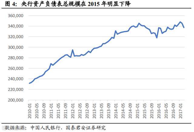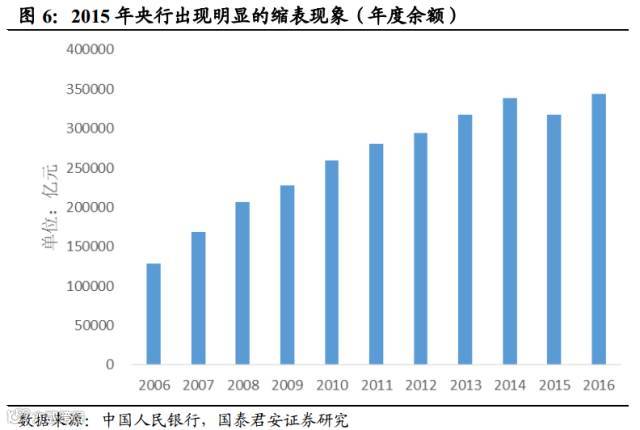 这里的外汇占款流失会引起央行被动“缩表”,而随后央行多次降准,加以对冲。从数据看,2015年央行总资产净减少约2万亿元。但是,央行降准明显是实行宽松的货币政策,“缩表”的现象与货币政策意图恰恰相反。