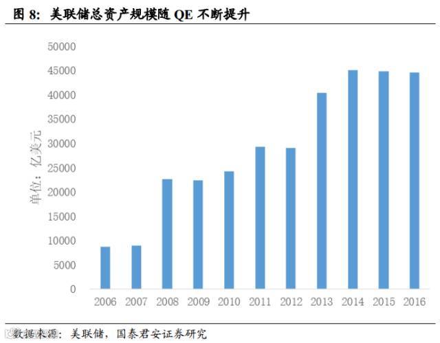 图中有三处明显的总资产快速扩张,分别对应2008年末开始的QE1、2010年末开始的QE2和2012年下半年开始的QE3。这一系列的扩表行为使得美联储的总资产自2007年金融危机前的8943亿美元,膨胀到2016年的44515亿美元,短短十年间扩张近4倍,而同期中国央行资产负债表仅扩张约1.6倍。