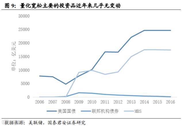 具体来看,美联储的资产主要投资于美国国债及MBS(抵押支持债券),此外也有少部分投资于机构债,主要是房利美和房地美的债券。2014年到2016年末,这三项资产的数额就几乎没有变动过。