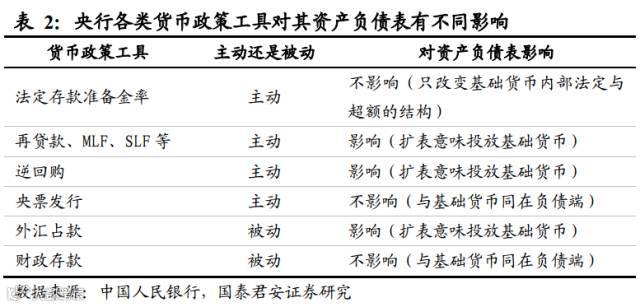 (1)央行用资产端工具调节基础货币,则将改变央行资产负债表规模。比如,对银行开展MLF、再贷款等操作,则央行资产负债表左边“对银行债权”科目增加,右边“基础货币(银行对央行存款)”科目增加,央行扩表。