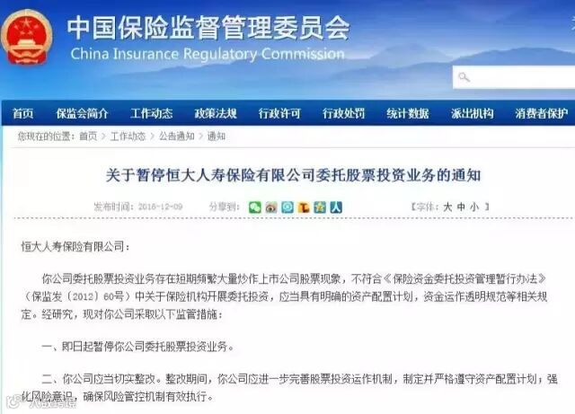 继停止恒大人寿互联网渠道保险业务后,保监会再次对恒大人寿挥出重拳。12月9日,保监会宣布,暂停恒大人寿委托股票投资业务。