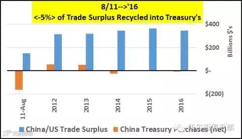 2011年8月至今,中国对美国的年贸易顺差超过3000亿美元,但是这些钱并没有用来买入美国国债。