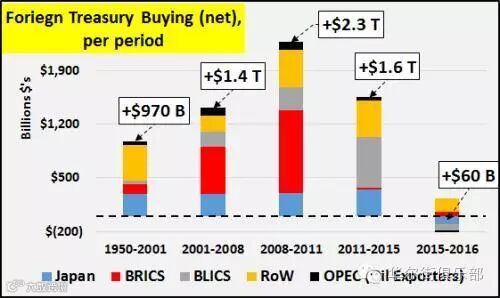 值得注意的是金砖国家自2011年开始停止买入美国国债,2011年至2015年期间被比利时,卢森堡,爱尔兰,开曼群岛和瑞士五国代替。