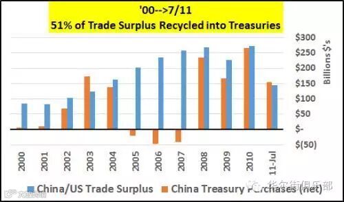 贸易顺差循环2000至2011年7月,中国对美国年贸易顺差为1800亿美元,其中有近900亿美元的顺差流入了美国国债。